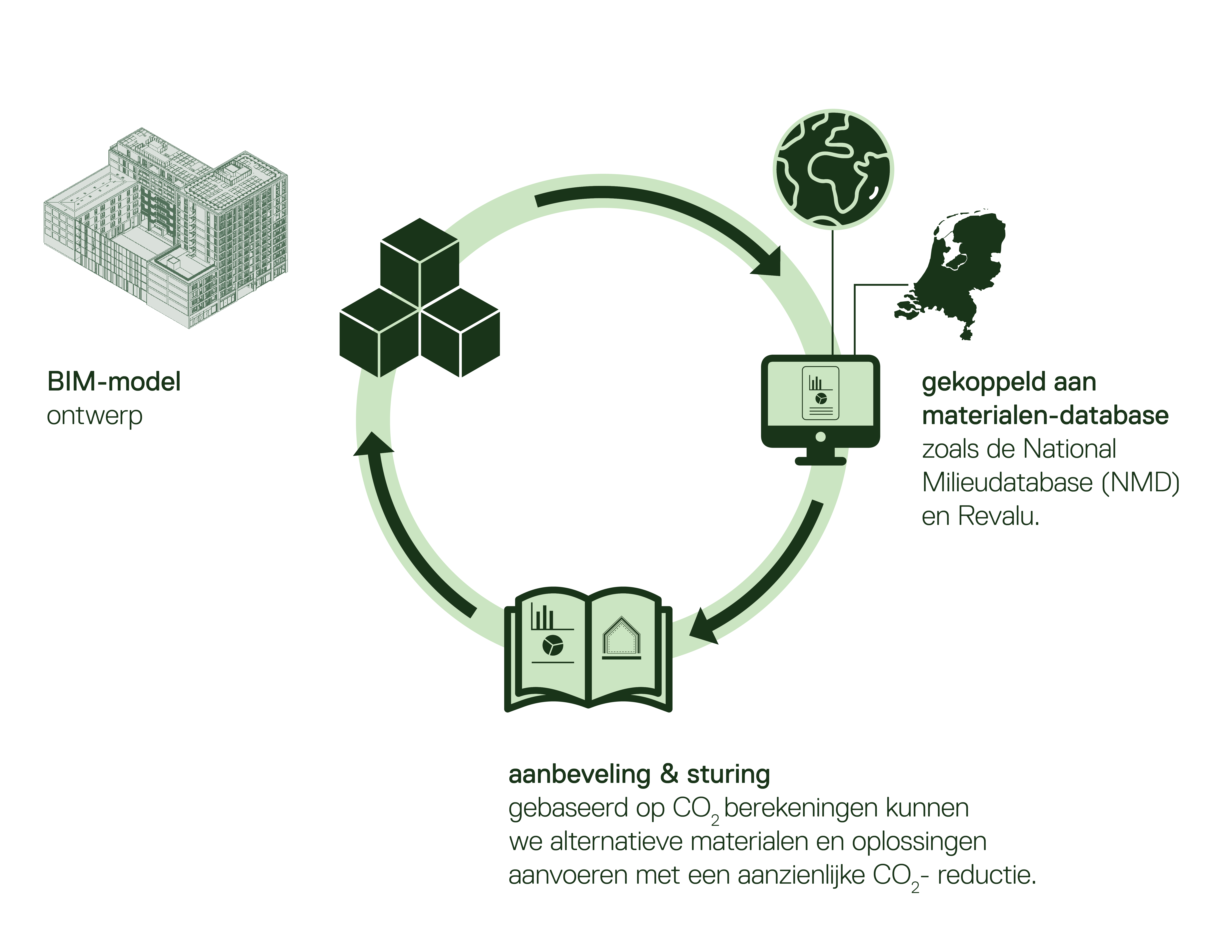 CO2-berekeningstools, zoals BIM-geïntegreerde LCA-calculators (bijv. BIMpact, OneClick), maken het mogelijk om alternatieven te vergelijken en iteratief te optimaliseren. Bij WRK maken CO2-berekeningen onderdeel uit van het ontwerpproces en worden ze niet pas aan het eind toegevoegd om naleving te bevestigen.