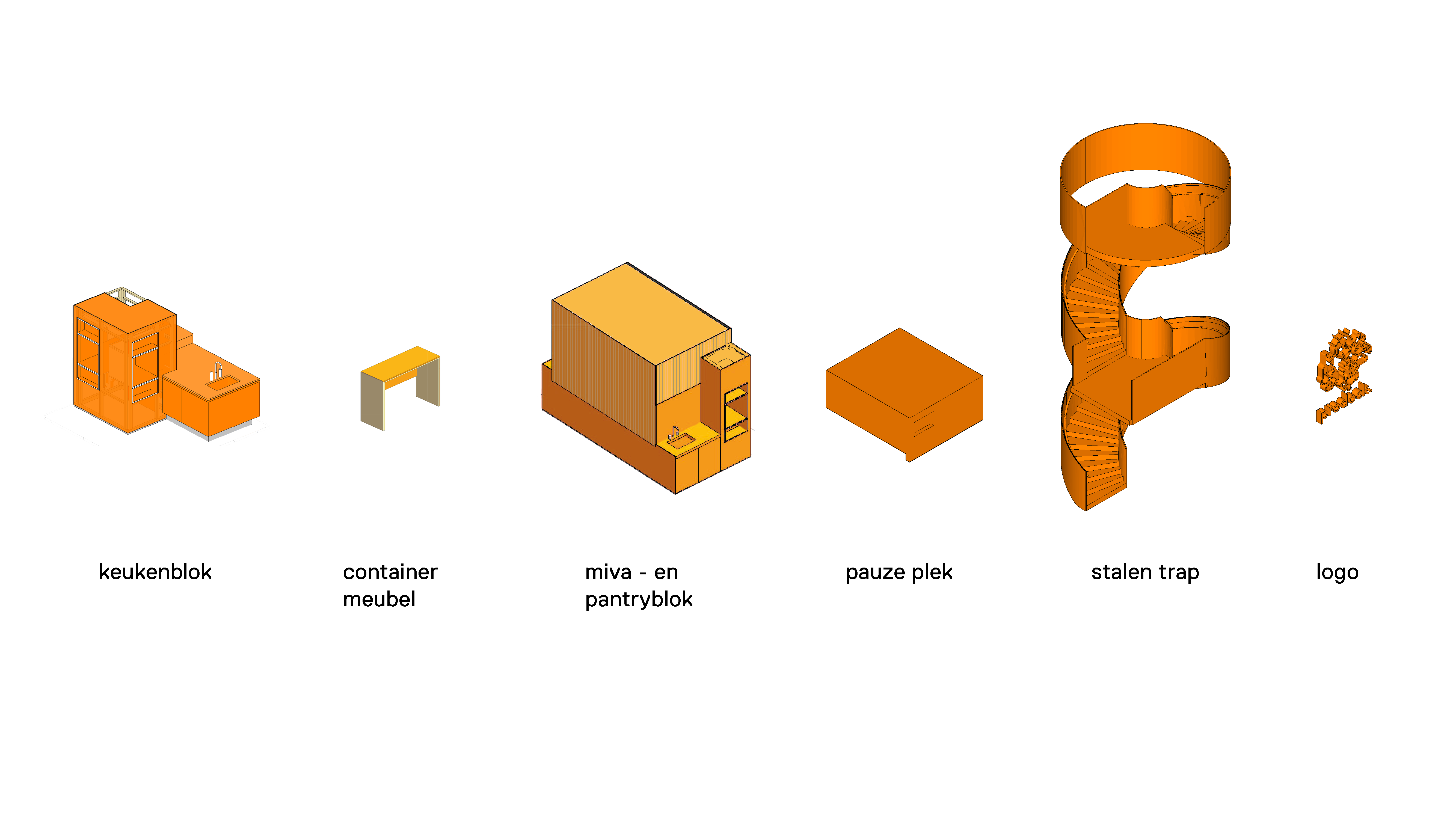 De elementen zijn ontworpen vanuit verschillende functies. Elke element is een samenstelling van meerdere materialen om het rondom interesant te maken, echter, altijd in de oranje kleur. Een pantryblok voor de kantine met bijhorende afvalsplek, en miva-toilet met een koffiehoek. In het entree komt een groot logo in samenspel met de gepoedercoate trap. Op de verdieping komt er een zitmeubel met waterpunt op de brug.