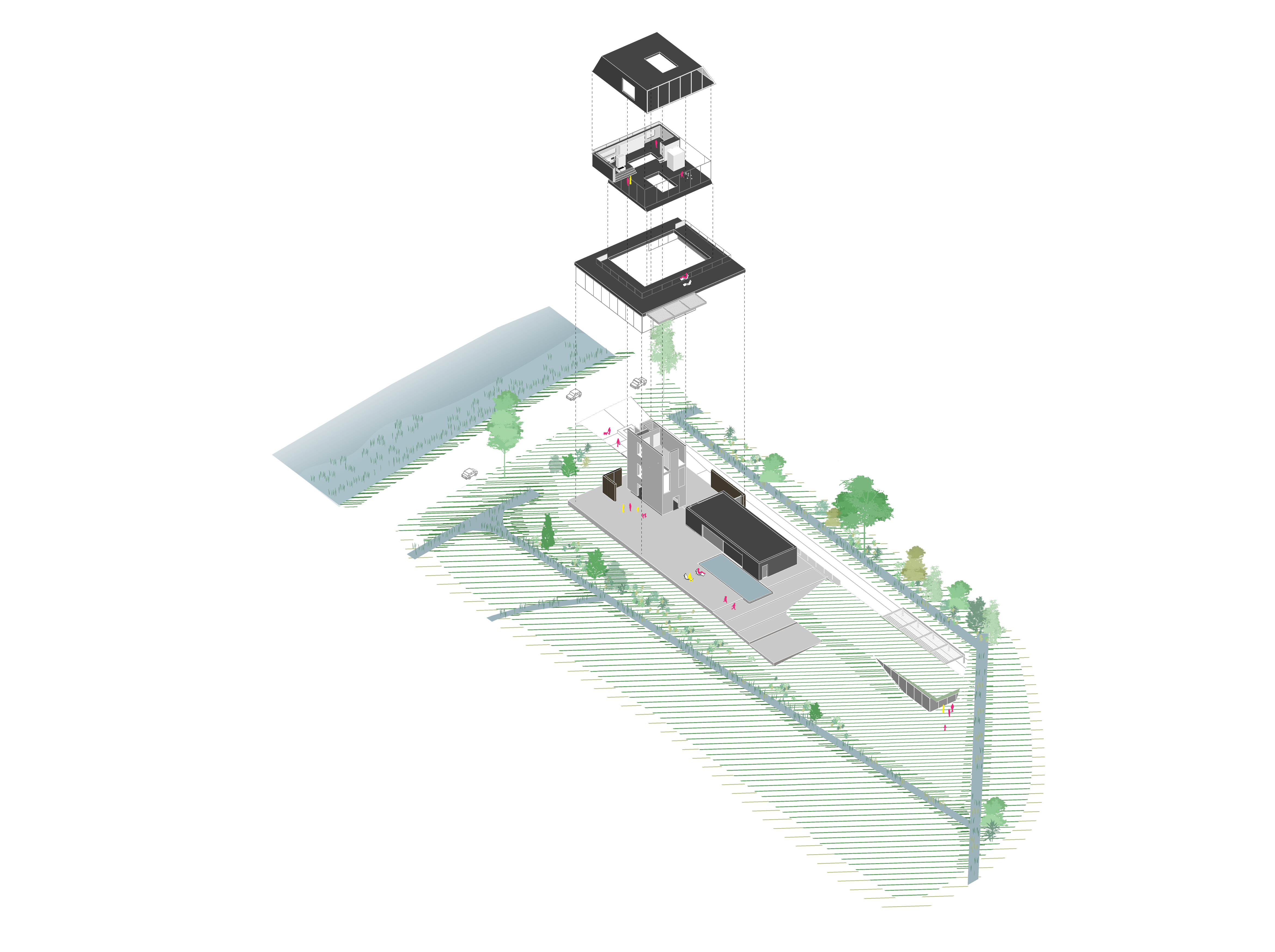De woning bestaat uit een massief basement dat in de dijk is vastgeworteld. Deze massa wordt naar boven toe smaller en fungeert als dragende kern. De robuuste kern draagt een stapeling van abstracte volumes. De ruimte tussen de volumes wordt transparant uitgevoerd met glas. Door de dozen verschillende afmetingen te geven en ten opzichte van elkaar te verschuiven onstaat een geleding in het volume. Tegelijkertijd is de compositie abstract waardoor zij zich terughoudend opstelt ten opzichte van haar omgeving.